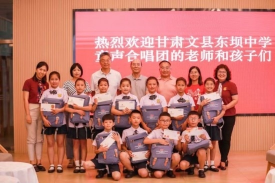 7月4日中午,在中國記協(xié)會(huì)客廳,文縣東壩童聲合唱團(tuán)的孩子們見到了他們熟悉的中國記協(xié)黨組書記、副主席劉思揚(yáng)爺爺。今年2月,劉思揚(yáng)爺爺專門來到文縣,走進(jìn)他們的排練廳,聆聽了他們即將在甘肅廣播電視總臺(tái)演出的曲目。他當(dāng)場(chǎng)說:“我被孩子們眼中的光深深地觸動(dòng)了。這是一種自信的、堅(jiān)毅的光。帶著這種光,無論你們將來走出大山,還是學(xué)成后回到山里建設(shè)家鄉(xiāng),這種自信和堅(jiān)毅的情愫都將伴隨你們終生。”今天孩子們都成了劉思揚(yáng)爺爺?shù)男】腿?。劉爺爺給孩子們講述了什么是記者、什么是記協(xié),鼓勵(lì)孩子們好好學(xué)習(xí),將來報(bào)效祖國。劉爺爺還為每個(gè)孩子準(zhǔn)備了滿滿一個(gè)大書包的各種禮物。孩子們排著演出隊(duì)形,為中國記協(xié)的老師們唱出了《大山里的孩子》,還有那首剛剛學(xué)會(huì)的、走進(jìn)央視錄音棚的《童心里的中國》: