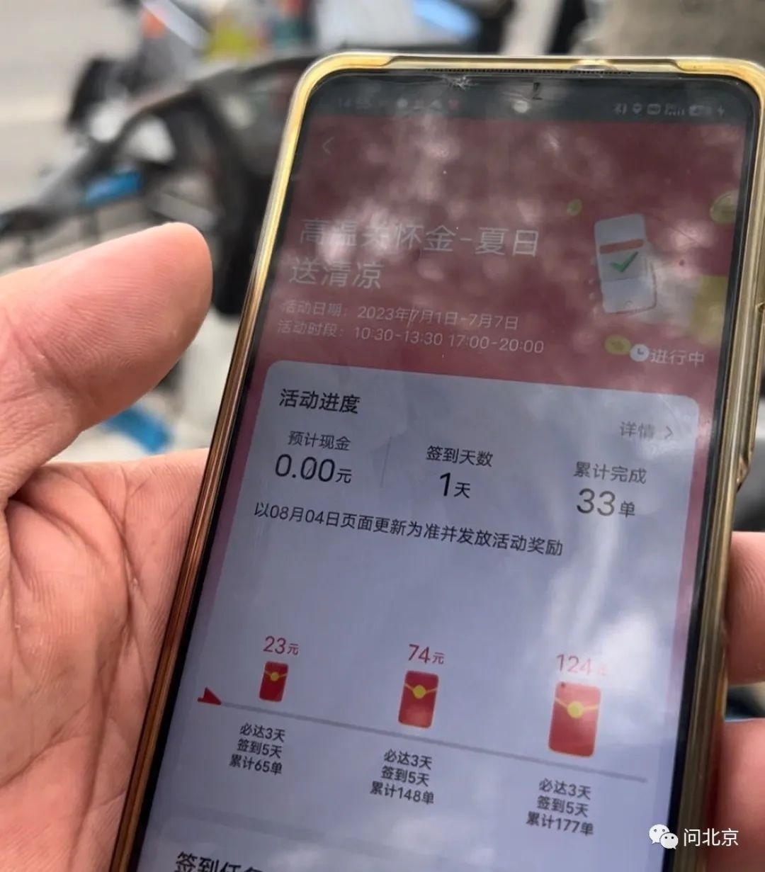 記者點(diǎn)進(jìn)活動(dòng)頁面看到,必達(dá)3天,簽到5天,累計(jì)65單可獎(jiǎng)勵(lì)23元錢,累計(jì)148單可獎(jiǎng)勵(lì)74元錢,最高獎(jiǎng)勵(lì)是累積177單可獎(jiǎng)勵(lì)124元。但是另一名外賣小哥告訴記者,所謂的高溫關(guān)懷金,只是另一種方式的沖單獎(jiǎng)勵(lì)。