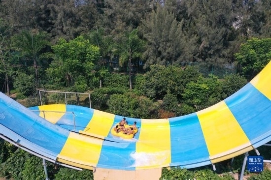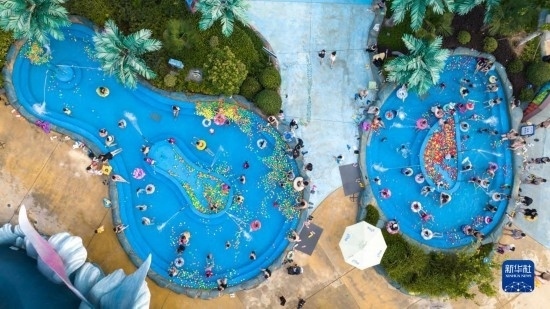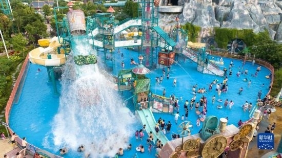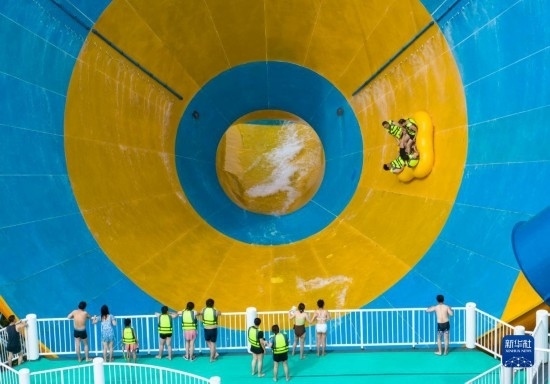 7月8日,游人在湖北省襄陽市華僑城奇夢海灘水樂園游玩(無人機(jī)照片)。
