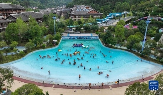 7月8日,在貴州省劍河縣溫泉小鎮(zhèn),游客在戲水消暑(無人機(jī)照片)。