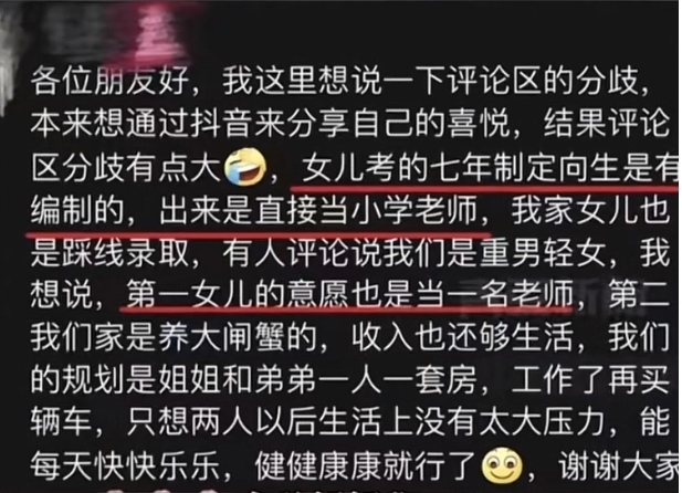 據(jù)女孩媽媽稱,孩子考的“七年貫通培養(yǎng)師范定向生”是有編制的,出來(lái)直接當(dāng)小學(xué)老師。家里不缺錢,只希望姐弟倆以后生活輕松快樂(lè)。