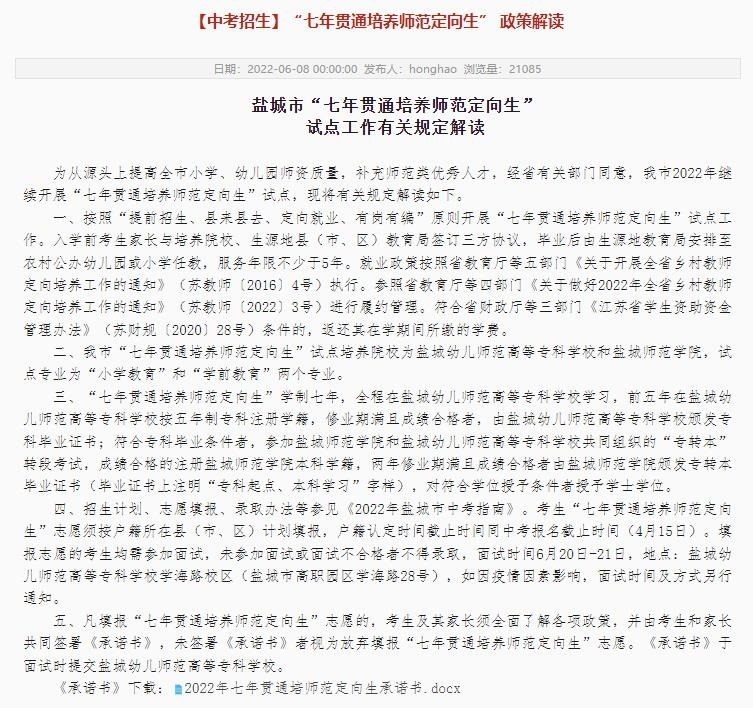 記者從鹽城幼兒師范高等專科學(xué)校官網(wǎng)看到,鹽城市從2021年起開(kāi)始試點(diǎn)培養(yǎng)“七年貫通師范定向生”,試點(diǎn)培養(yǎng)院校為鹽城幼兒師范高等??茖W(xué)校和鹽城師范學(xué)院,試點(diǎn)專業(yè)為“小學(xué)教育”和“學(xué)前教育”兩個(gè)專業(yè)。