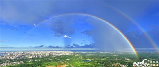 2023年7月9日,??谑刑炜粘霈F(xiàn)雙彩虹,景色迷人。