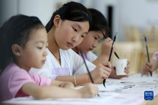 7月12日,在山東省臨沂市郯城縣郯城街道龍泉社區(qū),孩子們?cè)谏蠒?shū)法課。