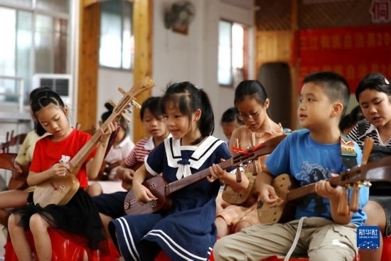7月12日,在廣西三江侗族自治縣文化館,孩子們?cè)趶棾酶琛?/p>