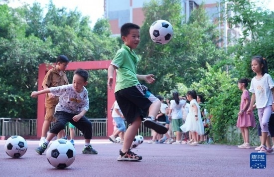 7月12日,孩子們?cè)谥貞c市北碚區(qū)青少年活動(dòng)中心踢足球。