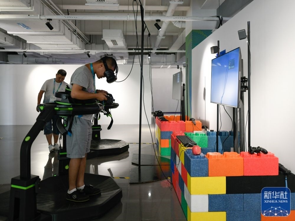 ↑7月14日,媒體工作人員在成都大運會主媒體中心休閑娛樂區(qū)內(nèi)體驗VR游戲。新華社記者 胥冰潔 攝