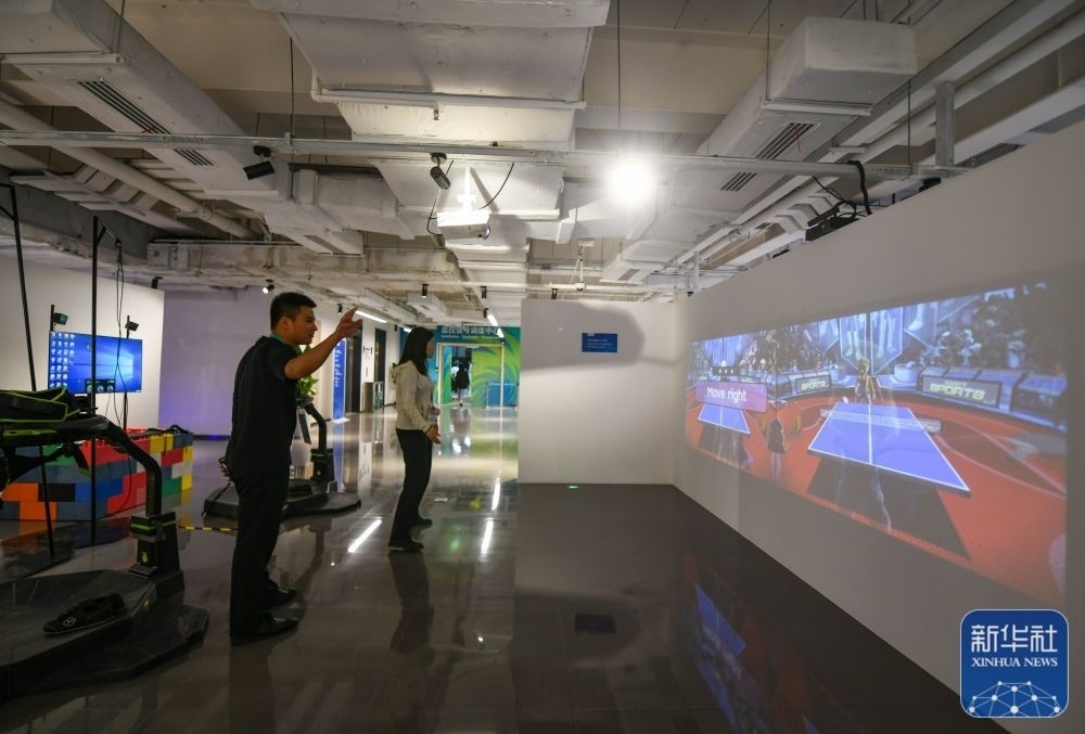 ↑?7月13日,在成都大運會主媒體中心的休閑娛樂區(qū),兩名媒體記者在體驗互動投影乒乓球。新華社記者 王曦 攝