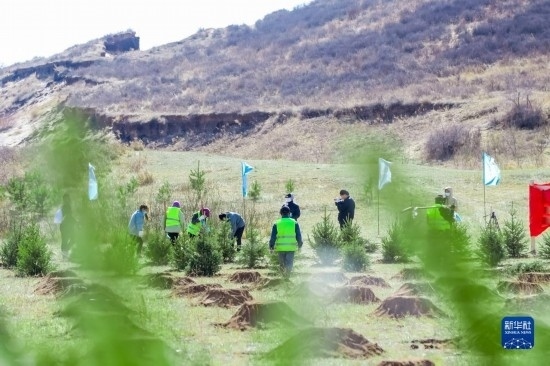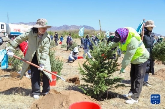 志愿者在內(nèi)蒙古渾善達(dá)克沙地栽種沙地云杉(2023年4月22日攝)。新華社記者 李云平 攝