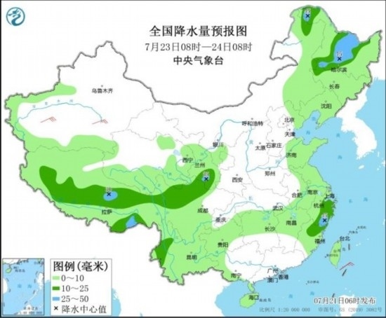 圖4 全國降水量預(yù)報(bào)圖(7月23日08時(shí)-24日08時(shí))