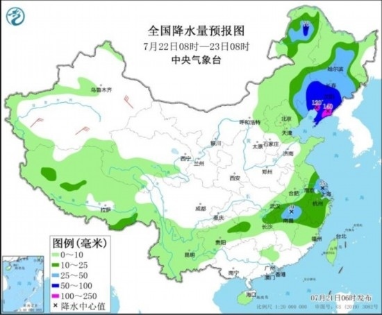 7月22日08時(shí)至23日08時(shí),內(nèi)蒙古東部、東北地區(qū)大部、江淮東部、江南東北部等地部分地區(qū)有中到大雨,其中,內(nèi)蒙古東南部、吉林南部、遼寧大部等地部分地區(qū)有暴雨或大暴雨(100~140毫米)。新疆南疆盆地和東部等地部分地區(qū)有4~6級(jí)風(fēng)(見圖3)。