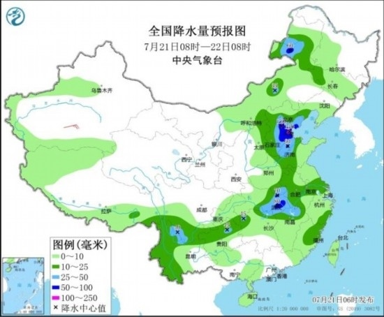 預(yù)計(jì),7月21日08時(shí)至22日08時(shí),內(nèi)蒙古東北部、河北東部、北京、天津、山東西北部、河南東南部、湖北東部、江西北部、四川南部等地部分地區(qū)有大到暴雨,其中,河北中部、北京東南部、天津南部等地局地有大暴雨(100~130毫米)。上述部分地區(qū)伴有短時(shí)強(qiáng)降水(最大小時(shí)降雨量20~50毫米,局地可超過60毫米),局地有雷暴大風(fēng)等強(qiáng)對流天氣。中央氣象臺(tái)7月21日06時(shí)繼續(xù)發(fā)布暴雨藍(lán)色預(yù)警。