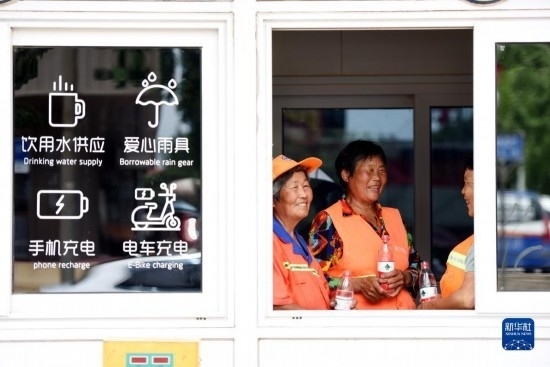 7月21日,山東省臨沂市郯城縣環(huán)衛(wèi)工人在“愛(ài)心驛站”消暑納涼。新華社發(fā)(房德華 攝)