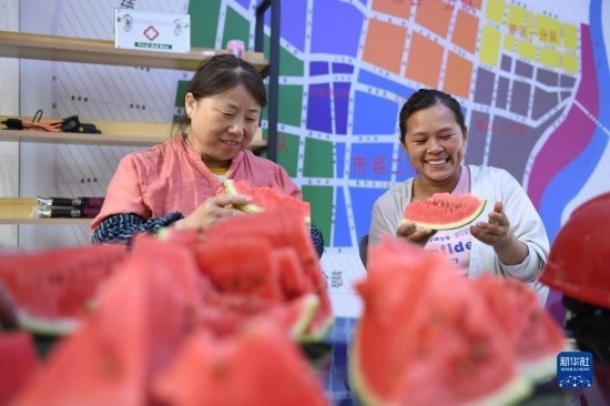 7月21日,山東省臨沂市郯城縣建筑工人在“愛(ài)心驛站”吃瓜消暑。新華社發(fā)(房德華 攝)