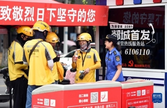 7月21日,在山東省臨沂市郯城縣“愛(ài)心驛站”,城管隊(duì)員為外賣(mài)小哥送上冰鎮(zhèn)水。新華社發(fā)(房德華 攝)
