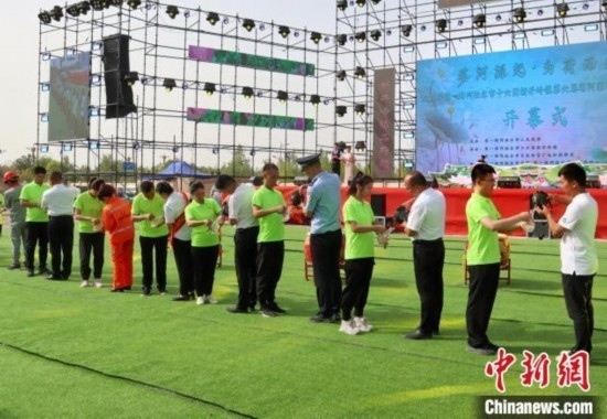 開(kāi)幕式上,11位優(yōu)秀行業(yè)代表傳遞塔河源頭之水,傳承兵團(tuán)精神。毛琴攝