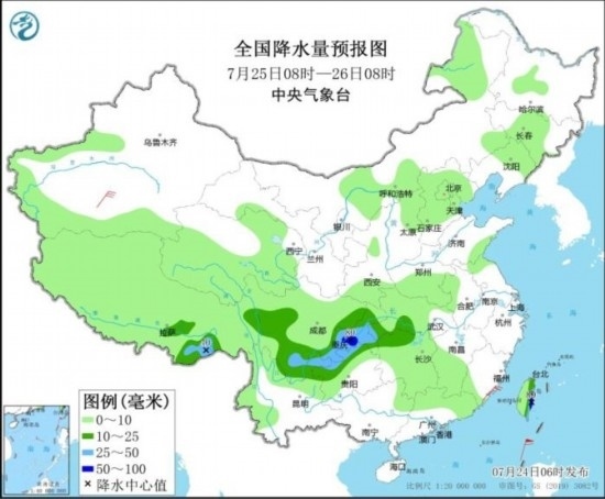 預(yù)計(jì),7月24日08時(shí)至25日08時(shí),四川盆地中南部、重慶大部、貴州北部、云南東北部、湖北西南部、湖南西北部以及浙江南部、福建中北部、江西南部、黑龍江北部、西藏東部等地部分地區(qū)有大到暴雨,其中,重慶南部等地局部地區(qū)有大暴雨(100~140毫米)。上述部分地區(qū)伴有短時(shí)強(qiáng)降水(最大小時(shí)降雨量30~50毫米,局地可超過70毫米),局地有雷暴大風(fēng)等強(qiáng)對(duì)流天氣。中央氣象臺(tái)7月24日06時(shí)繼續(xù)發(fā)布暴雨藍(lán)色預(yù)警。