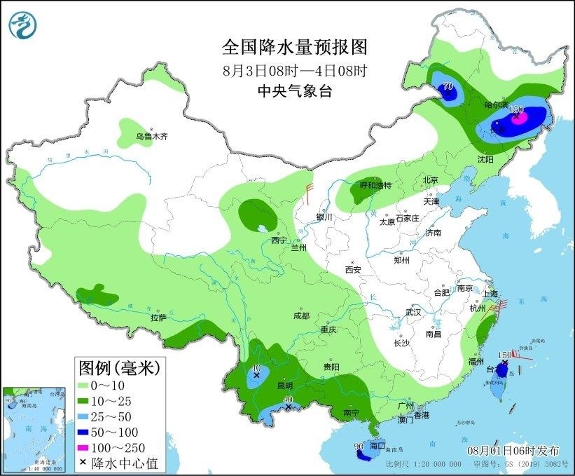8月2日08時(shí)至3日08時(shí),內(nèi)蒙古東部、黑龍江南部、吉林大部、青海北部、四川東部、貴州、云南、廣西西部、海南島、臺(tái)灣島等地部分地區(qū)有中到大雨,其中,黑龍江東南部、吉林中東部、海南島西南部等地局地有暴雨或大暴雨(100~150毫米)。遼寧中部、浙江北部等地部分地區(qū)有4~5級(jí)風(fēng)(見(jiàn)圖2)。