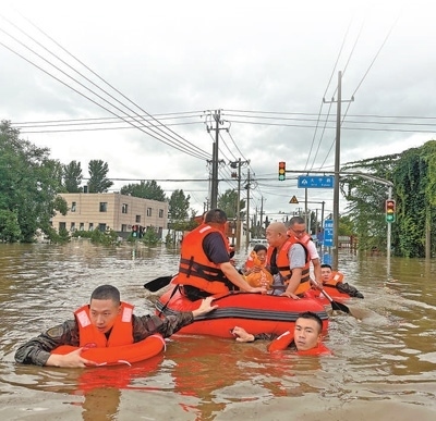 7月31日,武警北京總隊(duì)官兵在北京市房山區(qū)轉(zhuǎn)移被困群眾。當(dāng)日,共轉(zhuǎn)移6個(gè)村莊被困群眾676人,協(xié)助轉(zhuǎn)運(yùn)物資1000余件。李卓爾 王 斌攝影報(bào)道