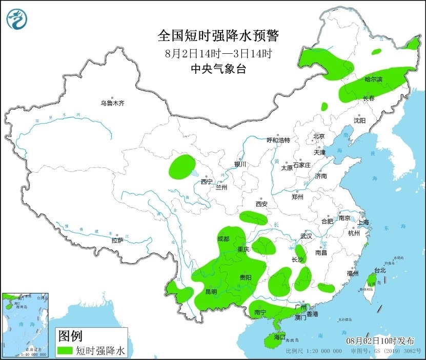 預計8月2日14時至3日14時,內蒙古東南部和中部、黑龍江東南部、吉林中西部、遼寧西北部、河北北部、臺灣島北部等地的部分地區(qū)將有8-10級雷暴大風或冰雹天氣;內蒙古東部、黑龍江東部和南部、吉林中西部、青海北部、陜西南部、湖南東部和西部、四川東部和南部、重慶西部和東南部、貴州大部、云南東部和西部、廣西南部和西部、廣東北部和西南部、海南島、臺灣島北部等地的部分地區(qū)將有短時強降水天氣,小時雨量30-50毫米,局地可達60毫米以上。