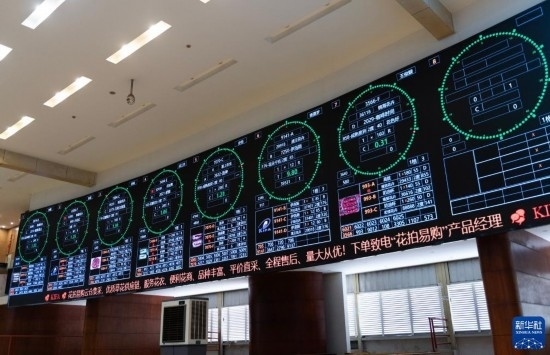 這是昆明國(guó)際花卉拍賣(mài)交易中心拍賣(mài)大廳的大屏上實(shí)時(shí)顯示的鮮花信息(7月13日攝)。新華社記者 陳欣波 攝