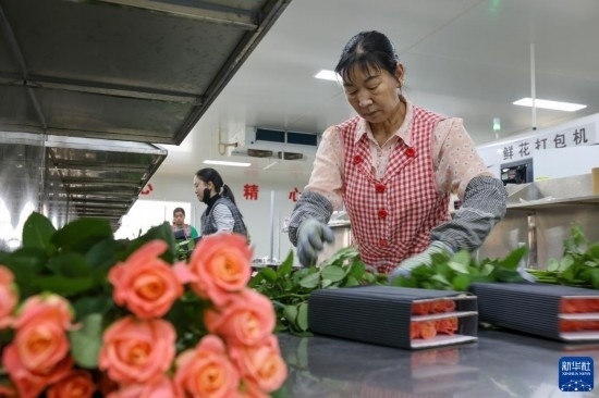 在云天化晉寧花卉產(chǎn)業(yè)現(xiàn)代化示范園內(nèi),花農(nóng)們將預(yù)冷處理后的鮮花放入自動(dòng)分揀流水線(xiàn)(7月12日攝)。新華社記者 崔文 攝