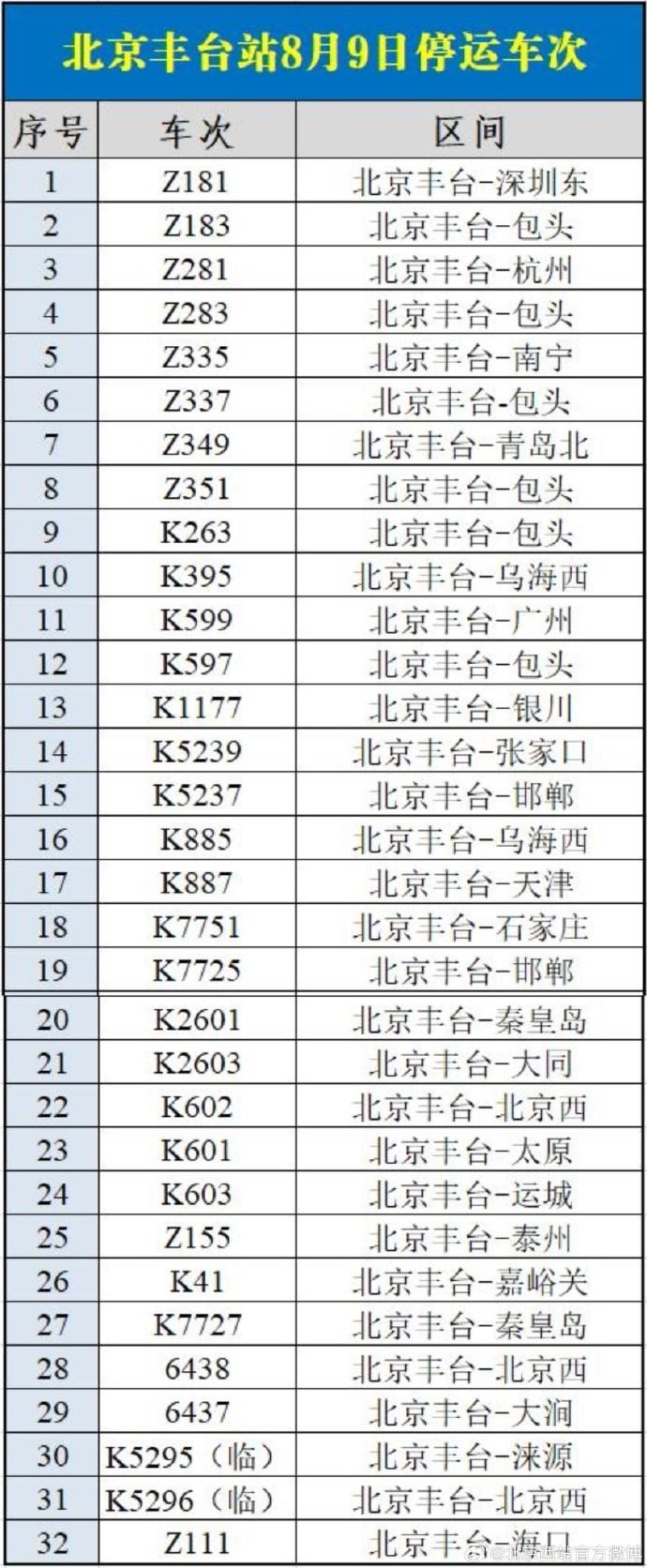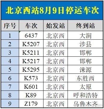 央視網消息:據@北京西站官方微博 消息,受水害影響,8月9日北京西站、北京豐臺站部分列車停運,已購買停運列車車票的旅客,可于30日內辦理全額退票手續(xù)。請廣大旅客合理安排出行,關注鐵路部門公告。
