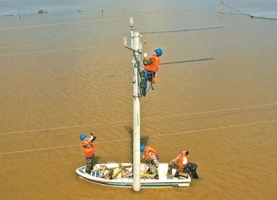 8月9日,國(guó)網(wǎng)長(zhǎng)春供電公司搶修人員在吉林省榆樹市懷家12組進(jìn)行作業(yè),為受災(zāi)群眾恢復(fù)生活用電。孟海鷹 張 鵬攝影報(bào)道