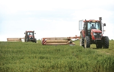 鹽池縣農(nóng)戶在牧草基地開展收割作業(yè)。 新華社記者 楊植森攝