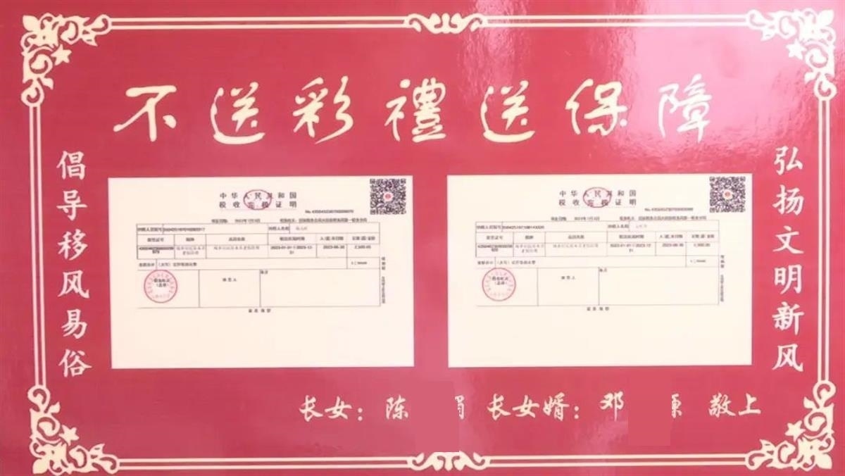 報道稱,8月17日,文江鎮(zhèn)的鎮(zhèn)村干部來到該鎮(zhèn)的聯(lián)盟村,將“不送彩禮送保障”的牌子送到新人陳某媚父母家中。文章配發(fā)的照片中,陳某媚的父母捧著印有兩張養(yǎng)老保險繳費單的牌子合影,底下的落款為長女陳某媚和長女婿鄧某塬的名字。