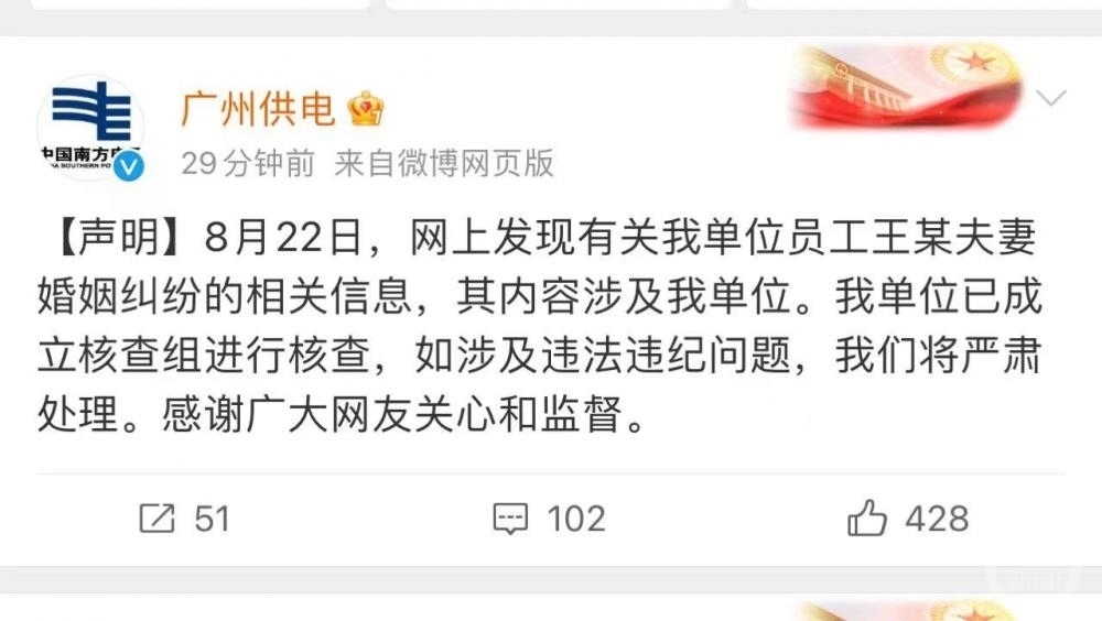 8月22日,南方電網(wǎng)廣州供電局職工王某斌被妻子舉報一事引發(fā)關(guān)注后,廣州供電局當(dāng)日晚間發(fā)布聲明,表示已成立核查組進行調(diào)查。