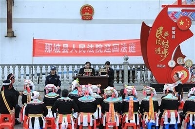 隆林各族自治縣人民法院以全國模范法官黃登林為榜樣,設(shè)立“登林巡回法庭”,創(chuàng)新運用黃登林“五大調(diào)解法”,開展壯漢、苗漢、彝漢等雙語巡回審判,滿足少數(shù)民族聚居地群眾的多元司法需求。同時,在德峨人民法庭打造“登林巡回法庭·崢嶸廳”和“民族團結(jié)同心苑”等文化場館,開展雙語普法,奏響“最炫民族風(fēng)”司法文化品牌的新樂章。