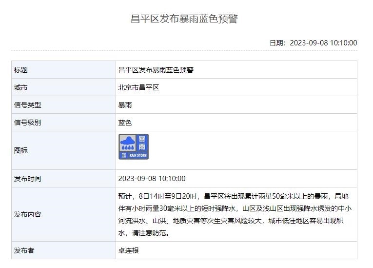 預(yù)計,8日14時至9日20時,昌平區(qū)將出現(xiàn)累計雨量50毫米以上的暴雨,局地伴有小時雨量30毫米以上的短時強降水,山區(qū)及淺山區(qū)出現(xiàn)強降水誘發(fā)的中小河流洪水、山洪、地質(zhì)災(zāi)害等次生災(zāi)害風險較大,城市低洼地區(qū)容易出現(xiàn)積水,請注意防范。