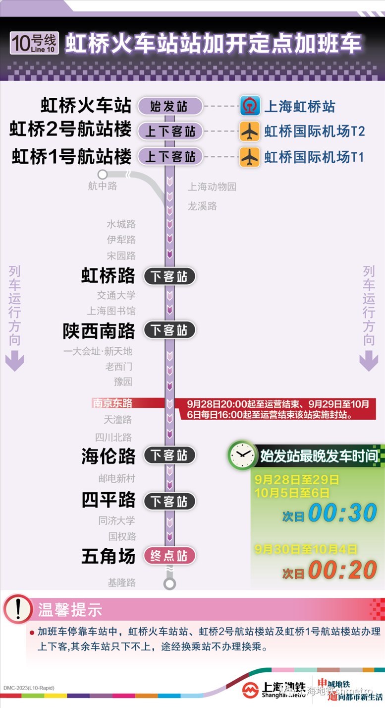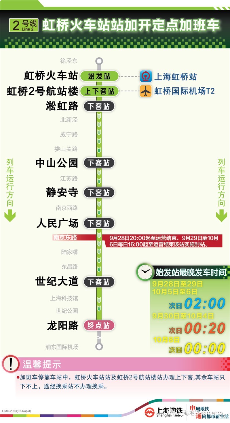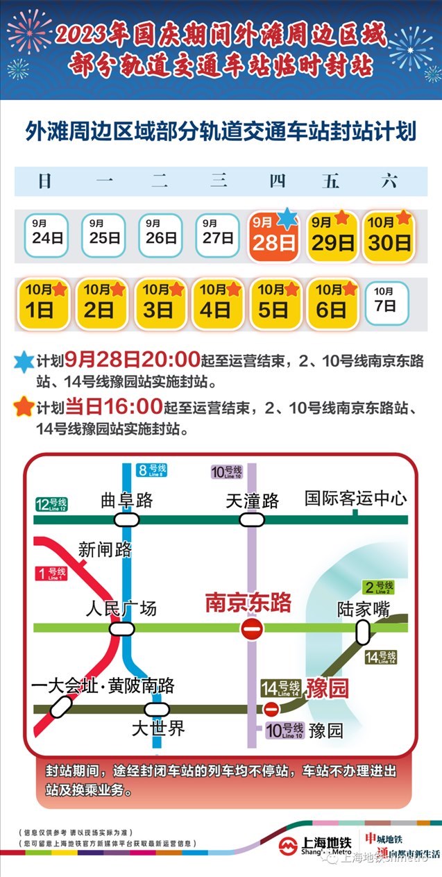 此外,9月28日20:00至運(yùn)營結(jié)束,以及9月29日至10月6日的每日16:00至運(yùn)營結(jié)束,地鐵2、10號(hào)線南京東路站,14號(hào)線豫園站計(jì)劃實(shí)施封站跳停。