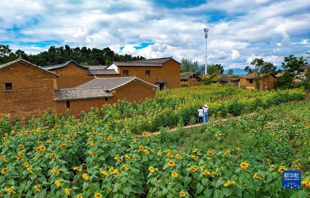 10月3日,游客在位于云南省昆明市滇池邊的臥龍古漁村內(nèi)游覽拍照(無(wú)人機(jī)照片)。