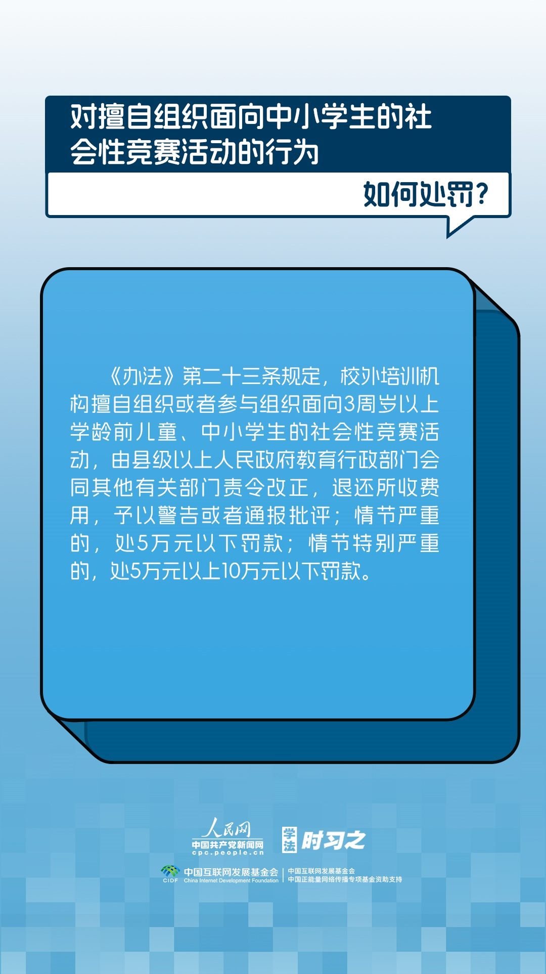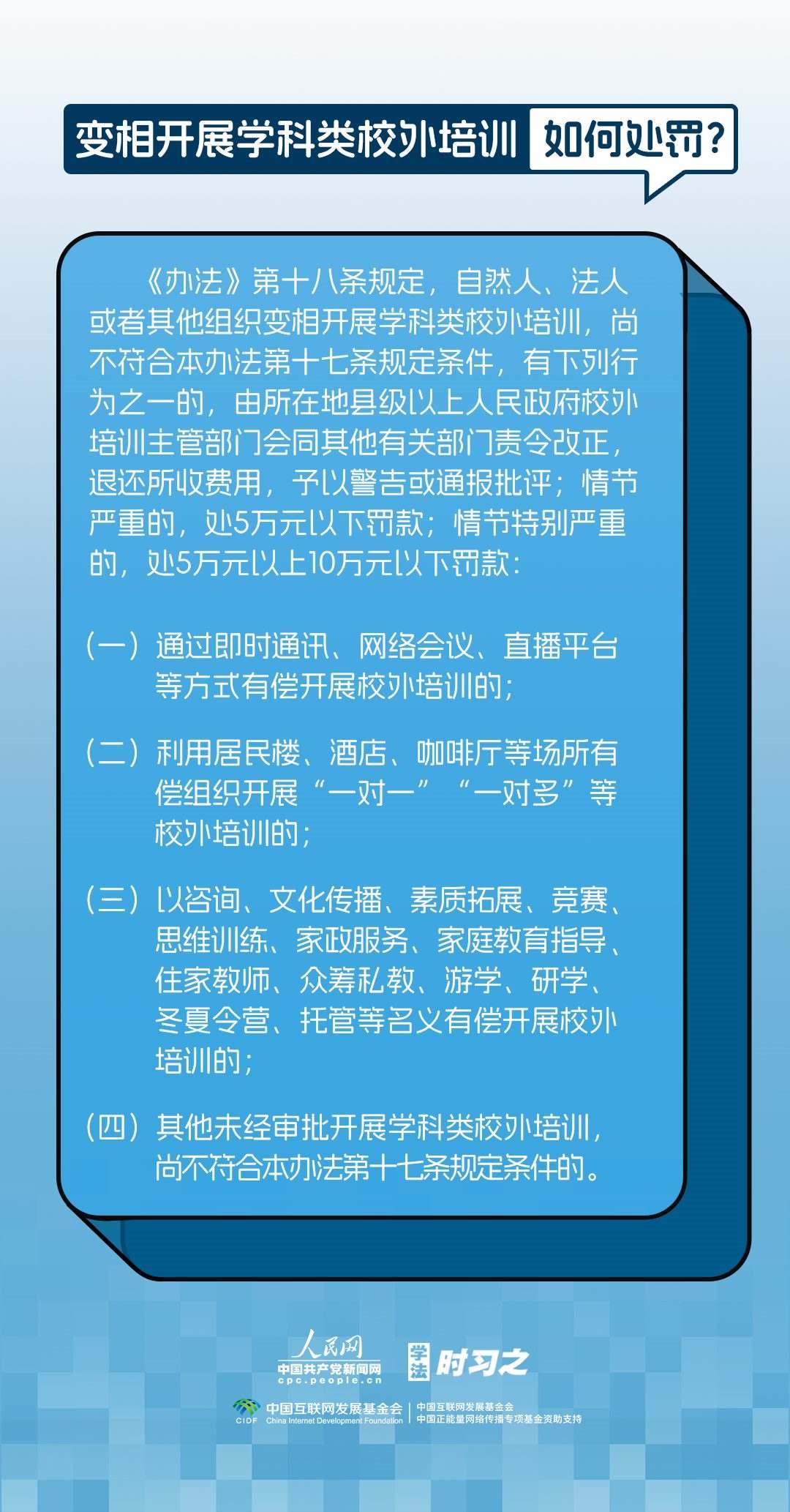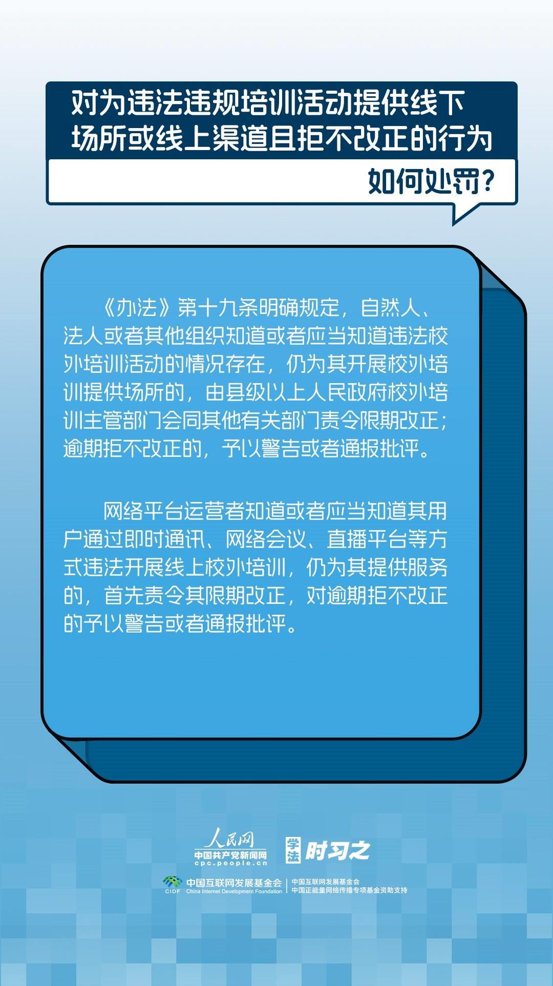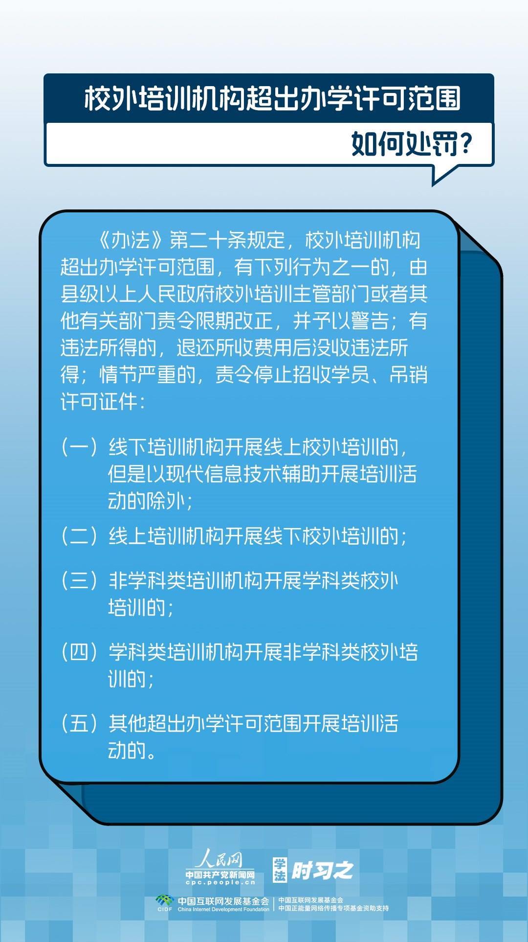 《校外培訓(xùn)行政處罰暫行辦法》(以下簡(jiǎn)稱《辦法》)將于2023年10月15日起施行?!掇k法》提出了校外培訓(xùn)行政處罰總體要求。規(guī)定適用對(duì)象為面向社會(huì)招收3周歲以上學(xué)齡前兒童、中小學(xué)生,違法開展校外培訓(xùn)的自然人、法人或者其他組織。要求校外培訓(xùn)行政處罰應(yīng)當(dāng)遵循公正、公開的原則,堅(jiān)持處罰與教育相結(jié)合,引導(dǎo)自然人、法人或者其他組織自覺守法,共同抵制校外培訓(xùn)違法行為,營(yíng)造有利于學(xué)生成長(zhǎng)成才的良好環(huán)境。