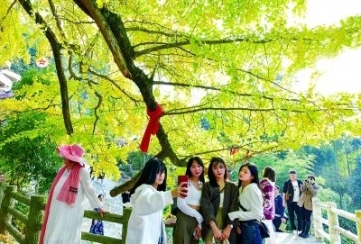 游客在貴州省貴陽(yáng)市烏當(dāng)區(qū)羊昌鎮(zhèn)黃連村的古銀杏樹下留影。新華社發(fā)
