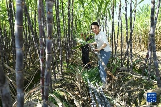 10月18日,在浬浦鎮(zhèn)外浦村的甘蔗田里,志愿者幫助農戶收獲果蔗。