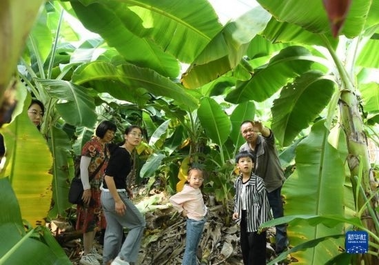 10月18日,在浬浦鎮(zhèn)陶姚村的香蕉大棚內,兒童在了解香蕉的生長習性。