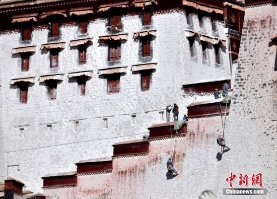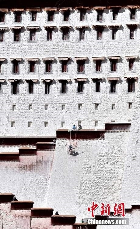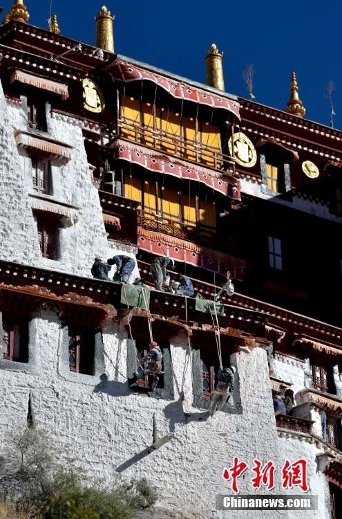 10月19日,西藏拉薩,工作人員對布達(dá)拉宮外墻噴灑涂料。每年秋冬交替時節(jié),布達(dá)拉宮外墻都要進(jìn)行粉刷“美顏”。按照慣例,每季粉刷將在藏歷9月22日“神降節(jié)”前完成。