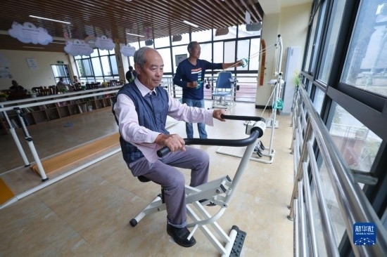10月26日,在杭州市富陽區(qū)湖源鄉(xiāng)居家養(yǎng)老服務中心,老人們使用健身器材鍛煉身體。