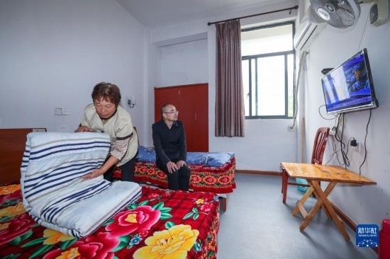 10月26日,工作人員在杭州市富陽區(qū)湖源鄉(xiāng)居家養(yǎng)老服務中心為老年人整理床鋪。