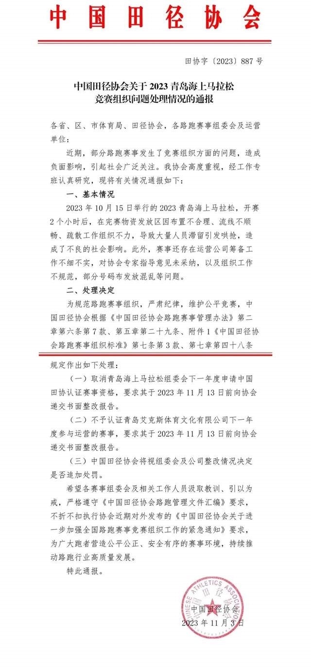 央視網(wǎng)消息:據(jù)“中國馬拉松平臺”官微消息,近日,部分路跑賽事出現(xiàn)了一些競賽組織問題,引發(fā)社會廣泛關(guān)注,造成了不良的社會影響。中國田徑協(xié)會高度重視、全面調(diào)查,依據(jù)事實(shí)和路跑賽事管理規(guī)定,從加強(qiáng)競賽組織,壓實(shí)各方主體責(zé)任,提示行業(yè)風(fēng)險隱患的角度,對相關(guān)單位和人員進(jìn)行了相應(yīng)處理?,F(xiàn)將處理情況通報如下: