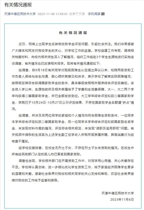 ·天津中德應用技術大學通報助學金事件調查結果:不存在國家助學金名額遭“擠占”情況。