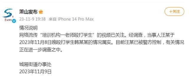 ·杭州蕭山通報“培訓機構一老師毆打學生”:屬實,打人者已被警方控制。