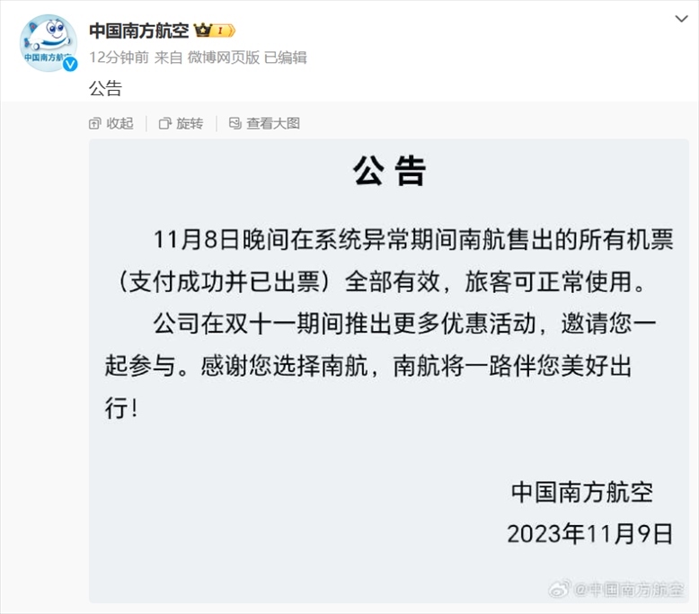 ·系統(tǒng)故障出現10元低價機票,南航回應:出票成功可正常出行。