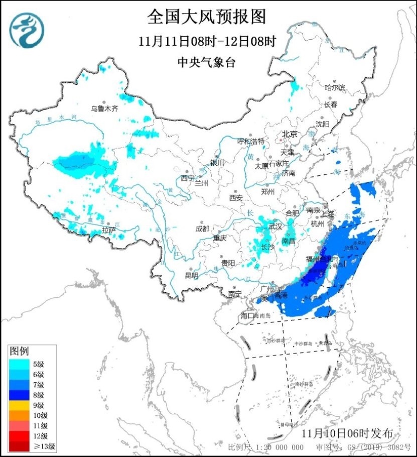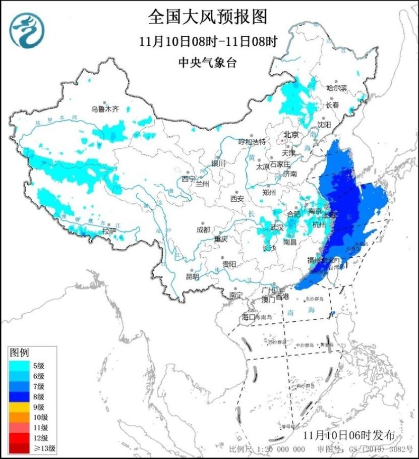 11月10日08時至11日08時,內蒙古中東部、遼寧西部、安徽中南部、河南南部、江蘇南部、上海、湖北南部、湖南東北部、江西北部、浙江北部及東部沿海、福建沿海、臺灣島沿海等地有5~6級、陣風7~8級的大風;黃海大部海域、東海大部海域、臺灣海峽、臺灣以東洋面偏北海域、南海東北部偏北海域將有7~8級、陣風9~10級的大風。11月11日08時至12日08時,安徽南部、湖北中東部、湖南大部、江西中北部、廣西東北部以及福建沿海、廣東東部沿海、臺灣島沿海等地有5~6級、陣風7~8級的大風;東海大部海域、臺灣海峽、臺灣以東洋面、南海北部海域、巴士海峽偏北海域將有7~8級、陣風9~10級的大風。中央氣象臺11月10日06時繼續(xù)發(fā)布大風藍色預警(見圖2、3)。