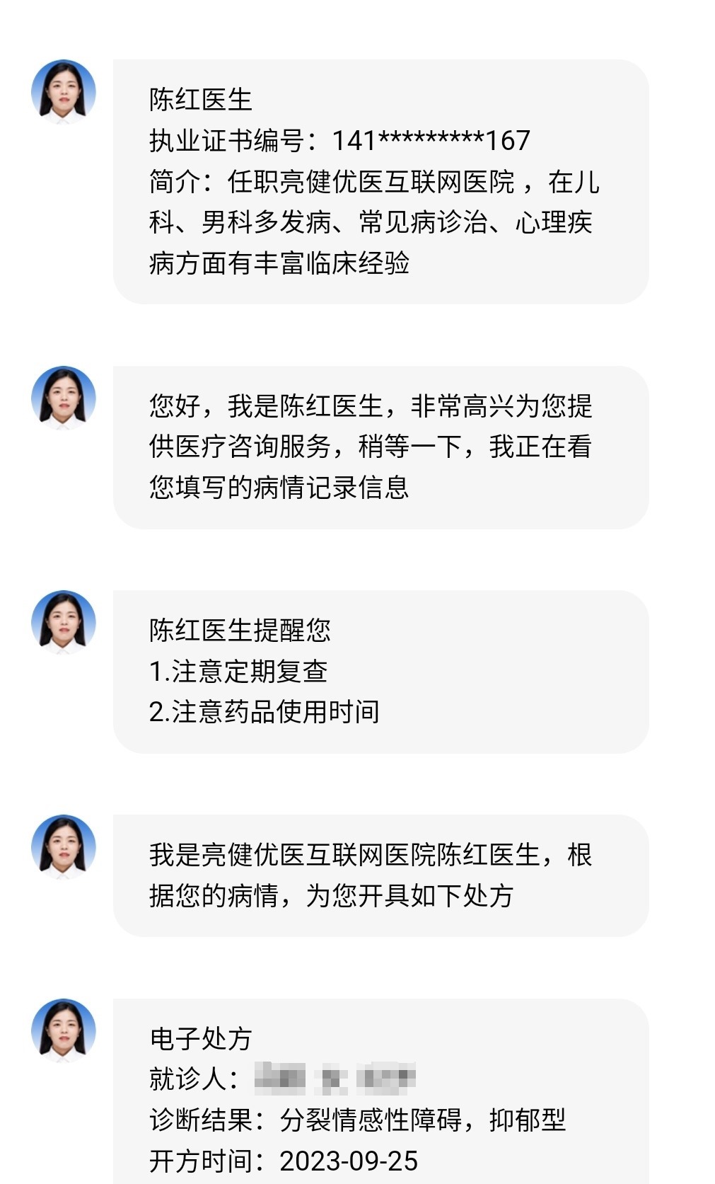 不僅是問診環(huán)節(jié)存在問題,開處方環(huán)節(jié)也有漏洞。記者發(fā)現(xiàn),一家名為“亮健好藥網”的企業(yè),在銷售抗抑郁類藥物“米氮平”“百憂解”等藥物時,其他平臺都需要上傳處方照片進行審核,而記者多次上傳不同樣式的風景照,每次都會跳出來一位“亮健優(yōu)醫(yī)互聯(lián)網醫(yī)院陳紅醫(yī)生”接診,根據(jù)介紹,她在兒科、男科多發(fā)病、常見病診治、心理疾病方面有豐富臨床經驗。根據(jù)記者上傳的風景照,陳醫(yī)生瞬間開具了電子處方,并進入了藥師審核階段。隨后記者取消訂單,并在不同時間,多次嘗試上傳風景照,發(fā)現(xiàn)每次都是這位陳紅醫(yī)生瞬間開方。雖然后續(xù)亮健平臺藥師都會致電記者要求補充處方才能開藥,但這位陳紅醫(yī)生卻總能第一時間看著風景照“秒開處方”。