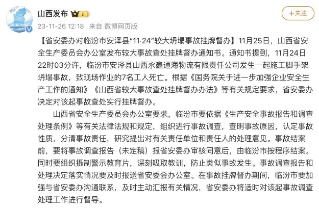 ·山西省安委辦對安澤縣腳手架坍塌致7人遇難事故掛牌督辦。