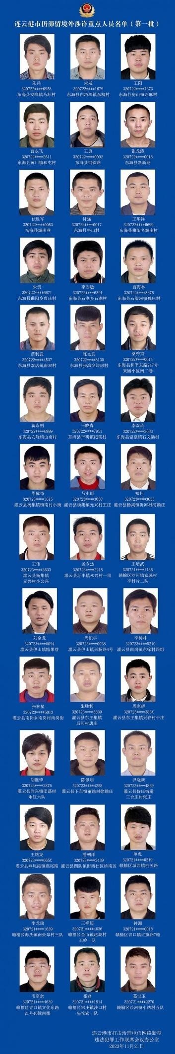 ·江蘇連云港警方發(fā)布首批42名非法滯留境外涉詐重點(diǎn)人員名單,要求滯留人員主動于2023年12月20日前通過正規(guī)渠道入境回國,并在入境前向戶籍地派出所報(bào)備。對于拒不回國投案自首的,司法機(jī)關(guān)將依法嚴(yán)懲。